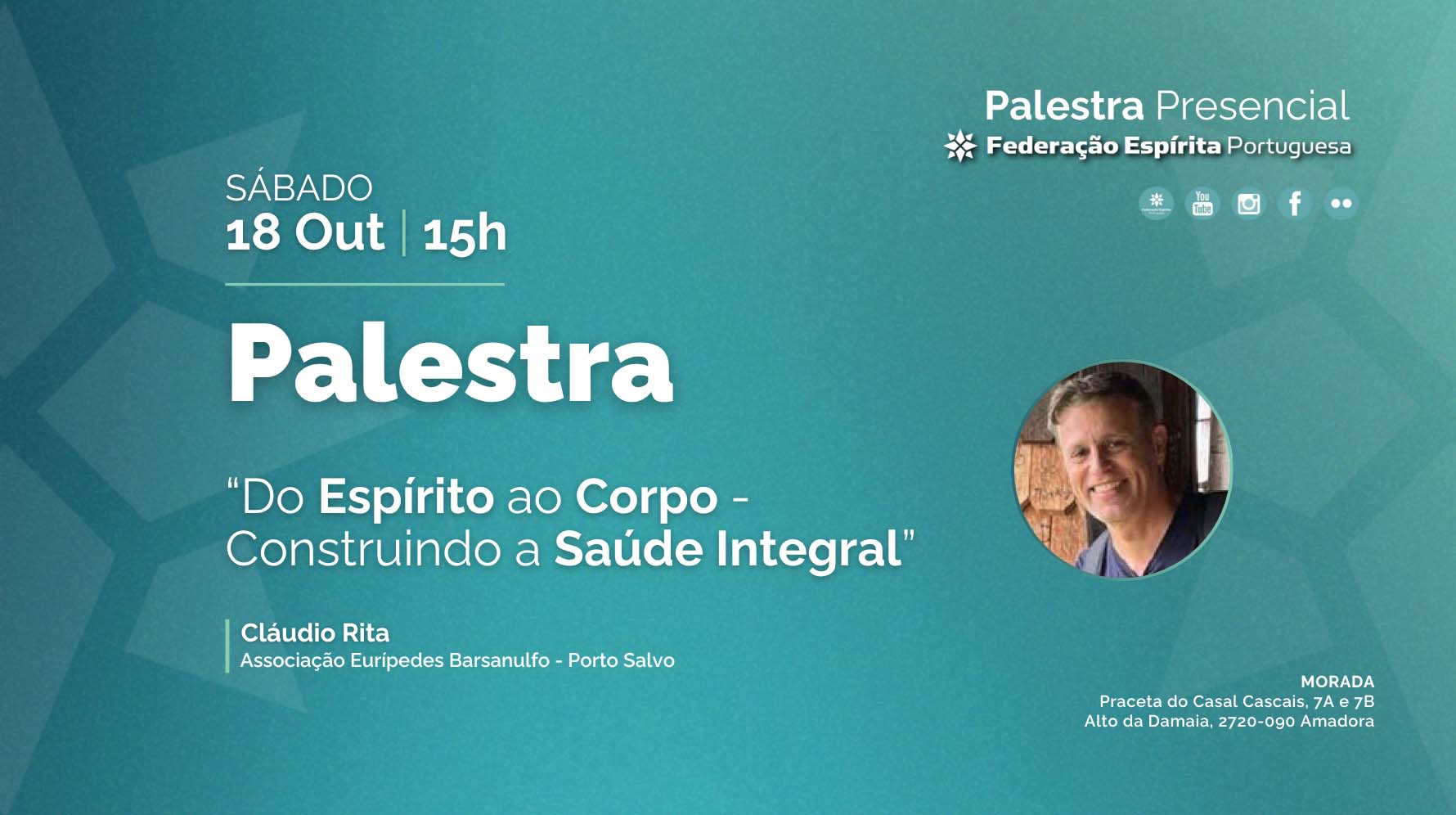 Dia 18 de outubro, sábado, temos connosco Cláudio Rita da Associação Eurípedes Barsanulfo a apresentar o tema: “Do Espírito ao Corpo (Construindo a Saúde Integral)”.