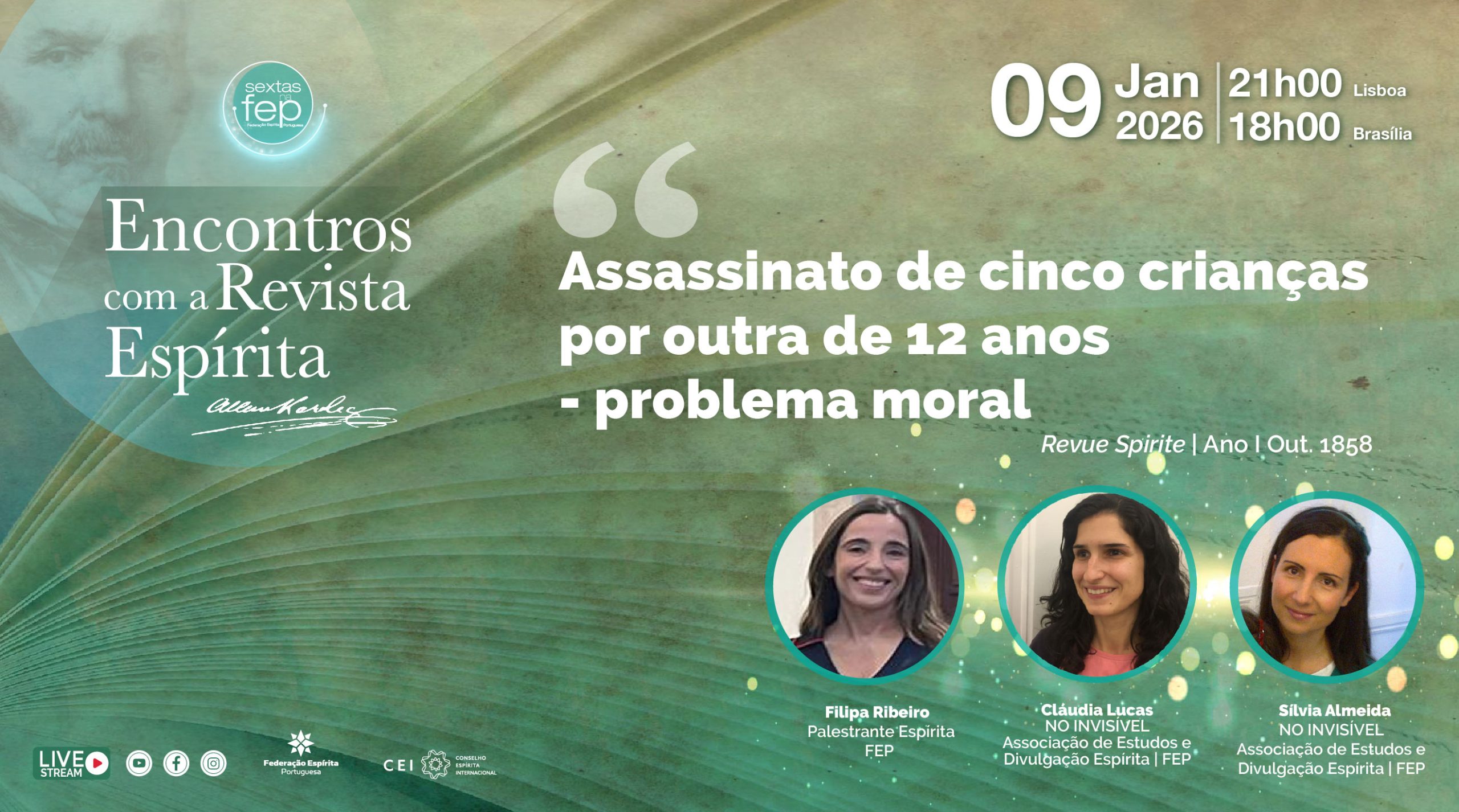 Neste espaço de reflexão e debate (online, em direto), esta semana estarão Filipa Ribeiro e Cláudia Lucas com mediação de Sílvia Almeida e irão debruçar-se sobre o tema da Revista Espírita de Allan Kardec, Out. 1858 – “Assassinato de cinco crianças por outra de 12 anos – problema moral”.