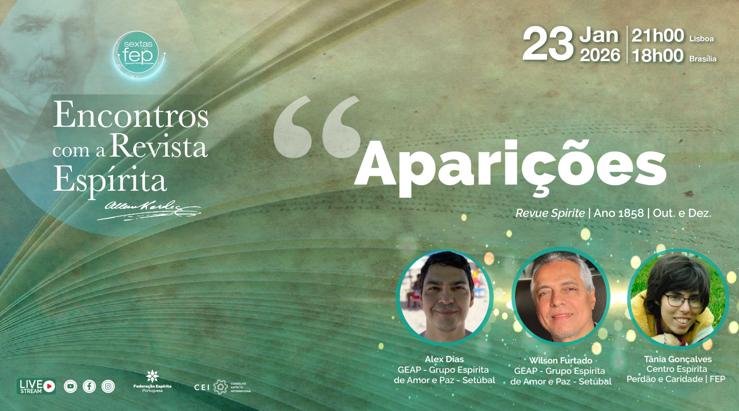 Neste espaço de reflexão e debate (online, em direto), esta semana estarão Alex Dias e Wilson Furtado com mediação de Tânia Gonçalves e irão debruçar-se sobre o artigo da Revista Espírita de Allan Kardec de outubro e dezembro de 1858, “Fenómenos de Aparição / “Aparições”.